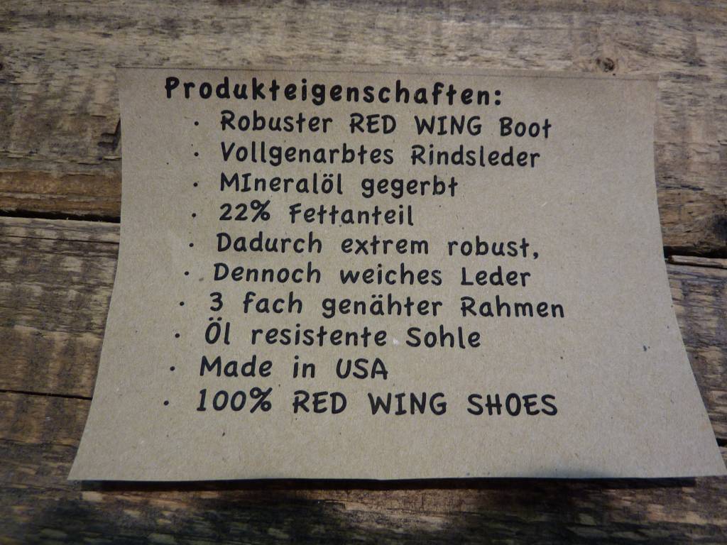 " Den mußt du dir verdienen" hören wir immer wieder in unseren Geschäften. Wer einen Red Wing das erste mal anprobiert ist überrascht. Man spürt sofort die Qualität, aber er muß eingelaufen werden. Dann wird er bequem wie ein Hausschuh. Wir empfehlen ihn mit einer etwas dickeren Socke zu tragen. Am besten Merinowolle.